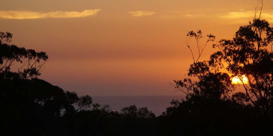 spreading over the Pacific and dusk folding over the tree clad mountains