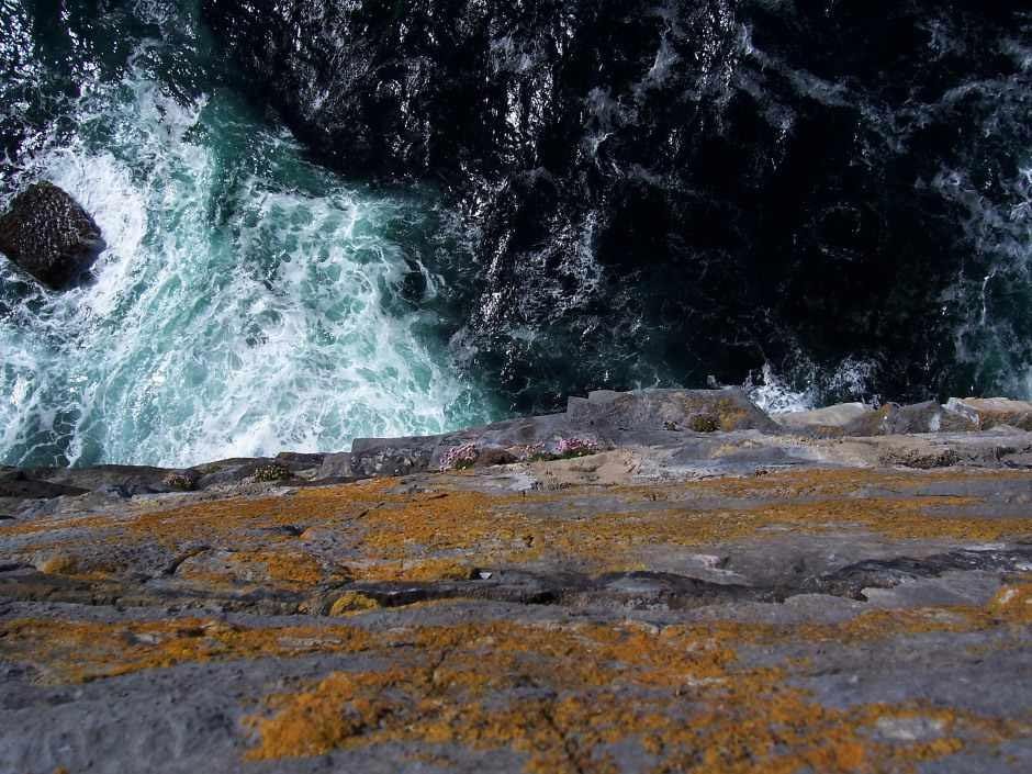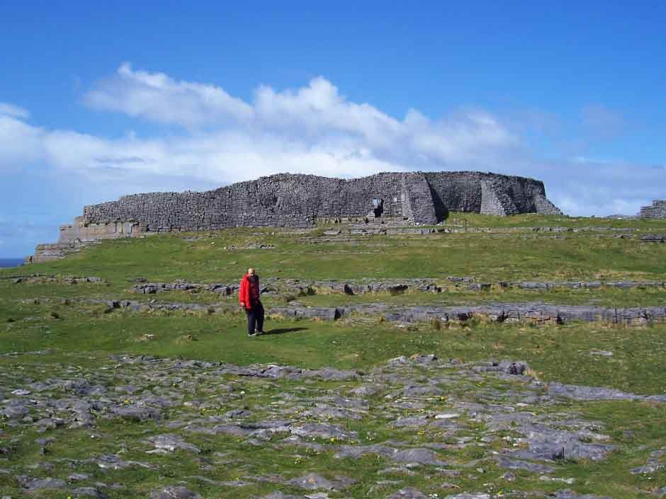 Dun Aonghas is a half a circle of four dry-stone walls and a “chevaux-de-frise” constructed from massive limestone blocks on the edge of vertical sea cliffs. The hundred metre drop to the Atlantic Ocean and wonderful construction make it the most impressive site in Celtic Europe. It is thought to be iron age.