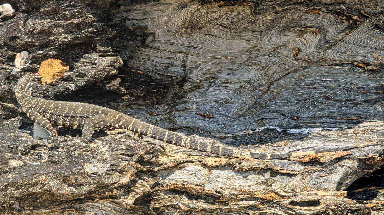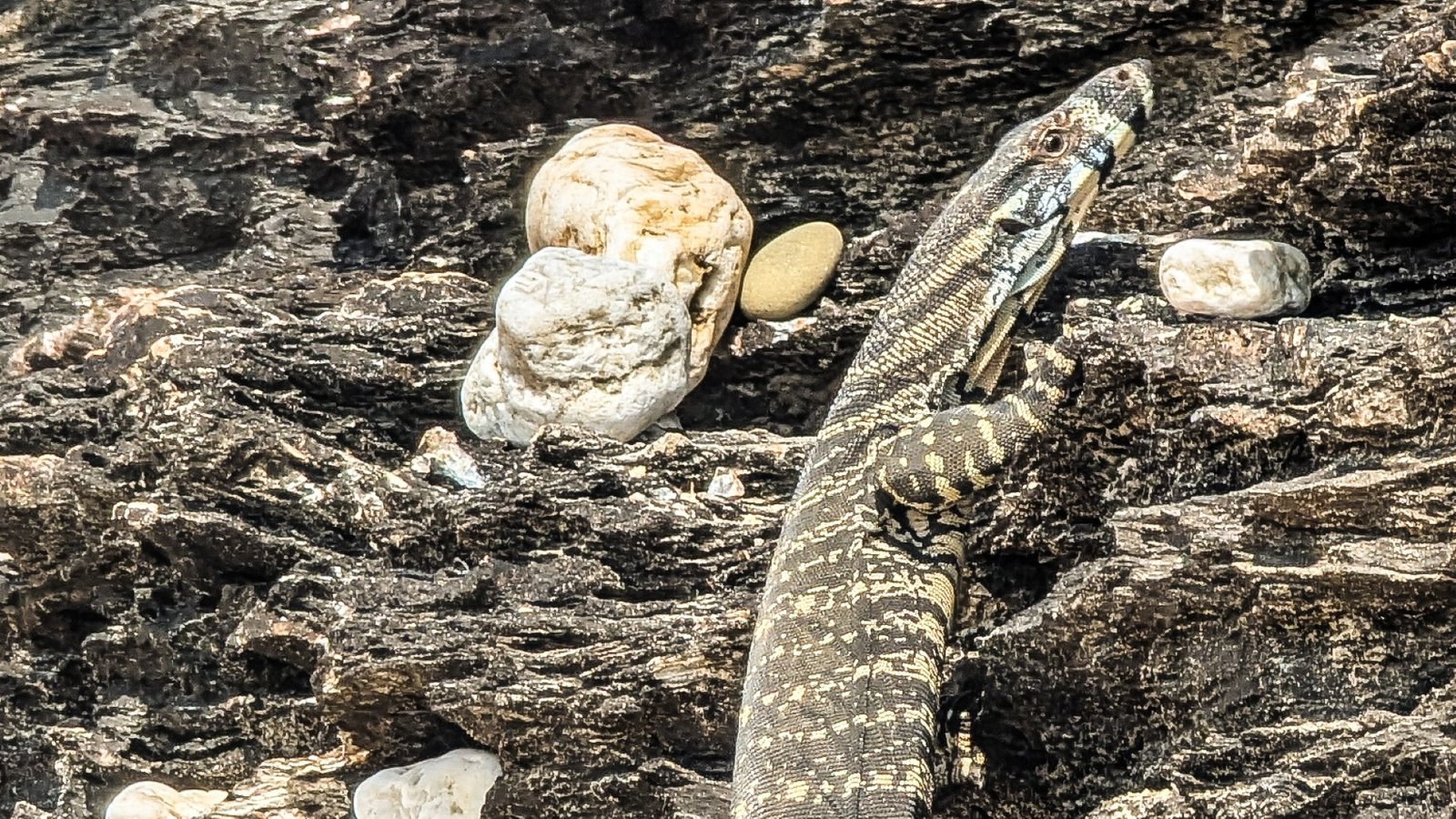 We fnd a goanna inside the Women’s Cave which then emerges and heads up the cliff towards the snake. We should have waited, but then as we left the Swallows regained their cave.