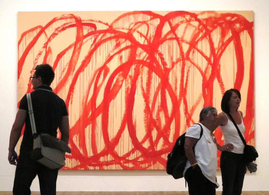 “They literally consist of nothing more impressive than enormous white canvases covered from head to foot in loops of red paint. Some of the loops have dribbled down the canvas. These are described by the blurb accompanying the paintings as ‘sanguine floods of paint that ooze and cascade down the canvas.’ . . .  Twombly was probably too lazy to let the work dry properly, and returning to find that the colours had run, sat down in a heap on the floor and tried to dream up some pseudo-philosophical justification for his negligence.” Harrywaight’s Blog, Oct 2010.
