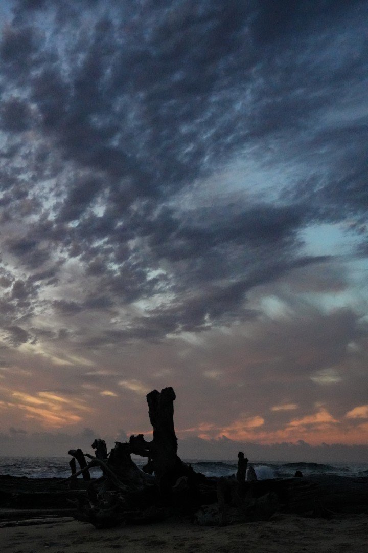 A ball rolling into the surf is a scrambling ghost crab. A bright sunrise is no longer on the cards. This slow beginning helps me slacken and holster the camera. Everything remains interesting.