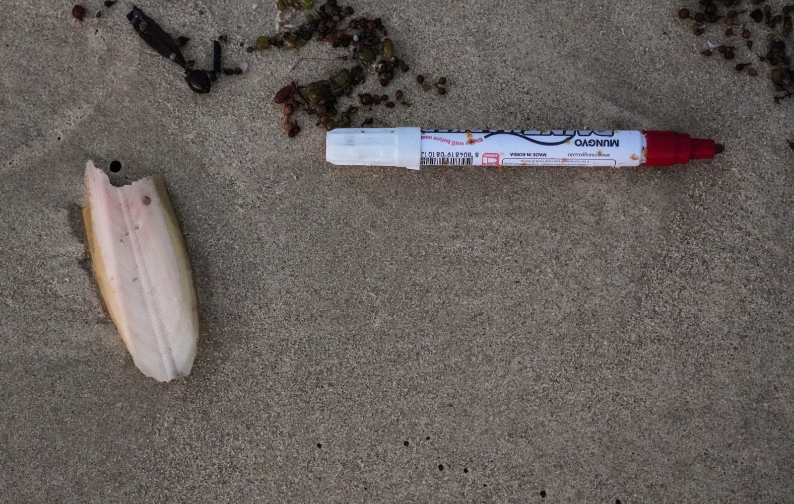 Their internal shells wash up as memorials along with all our stuff the sea has given up. We easily recognise the manufactured: a severed plastic bottle, a permanent ‘Paint Pen’ (red) made in Korea from oil and used for the alphabet and design.
