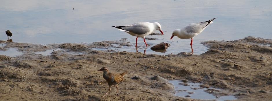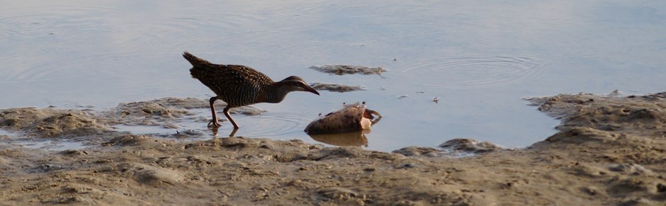 A pair of Sacred Kingfishers bob to size us up as we leave the car, then a Buff-banded Rail comes into view, sniffs out a fish head.