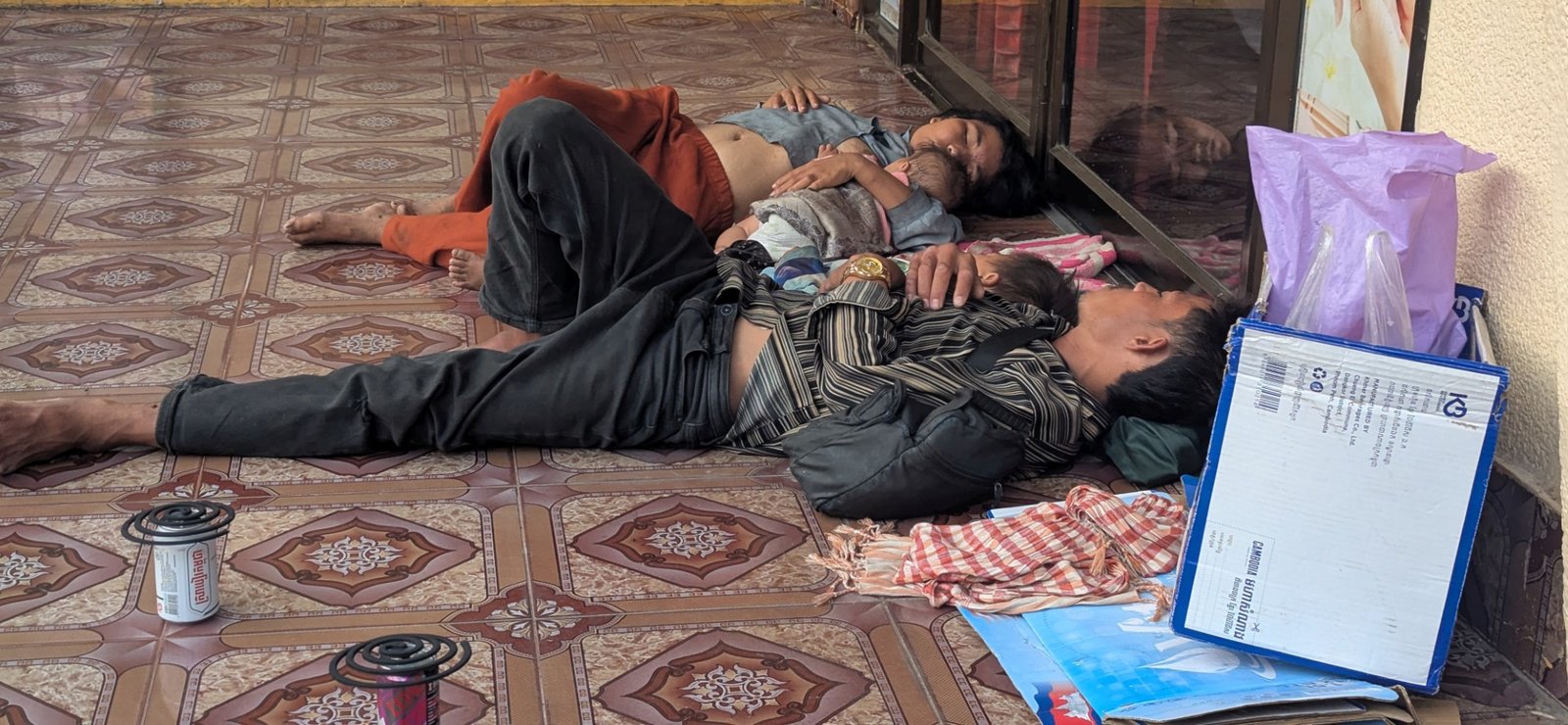 Khmer people were happy to be photographed, never once asked for money. These images are from one early morning in Siem Reap. I asked if I could take these images except for the sleeping family. The one image I wondered about. His face asleep in the reflection. They didn’t look like beggars, see his gold watch (fake) on his wrist, were well dressed if shoeless. And why are the mosquito coils unlit. So what was – IS – their story?