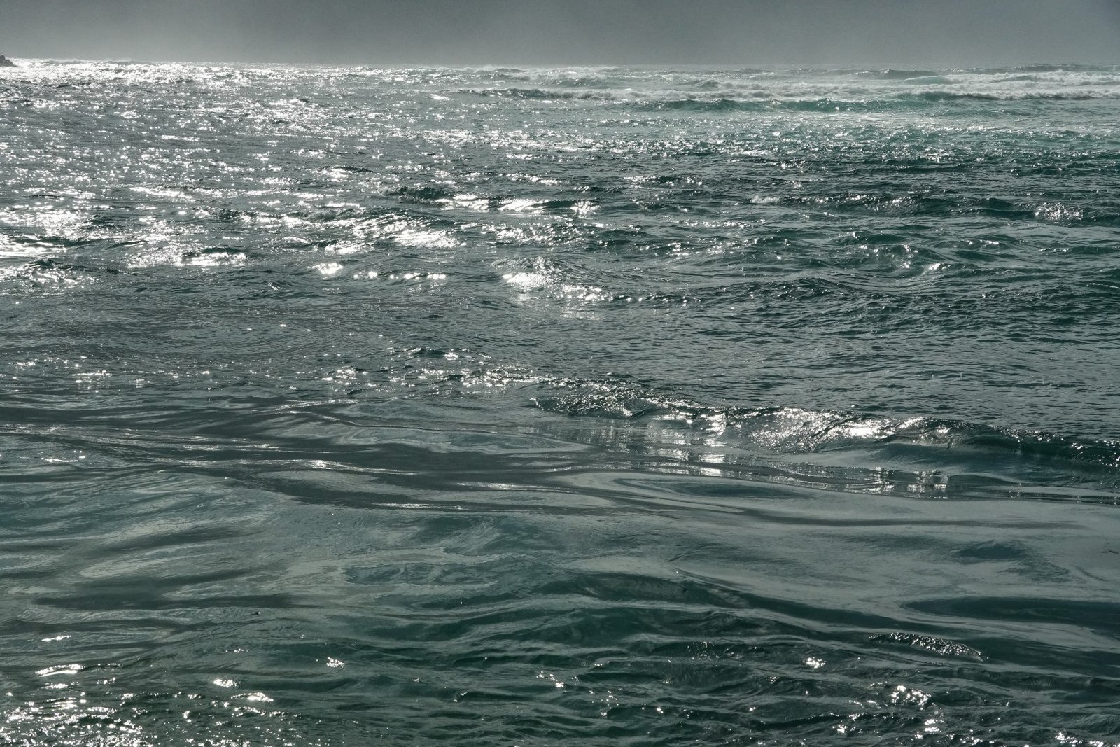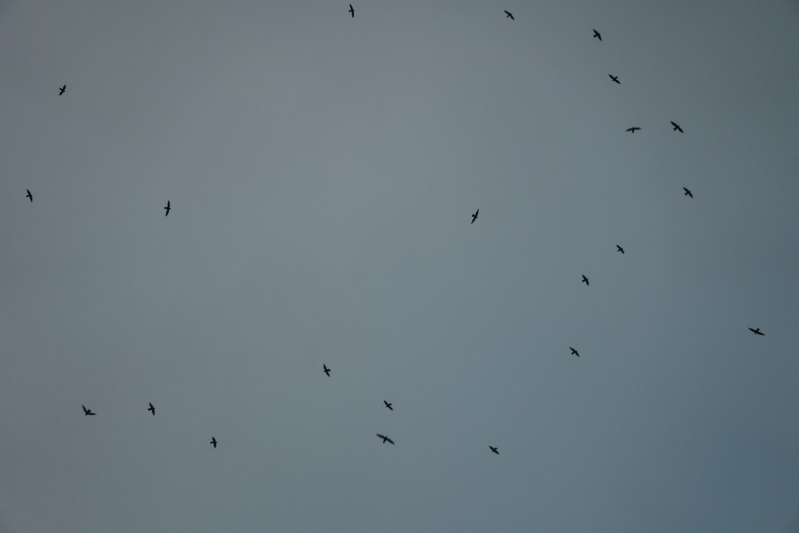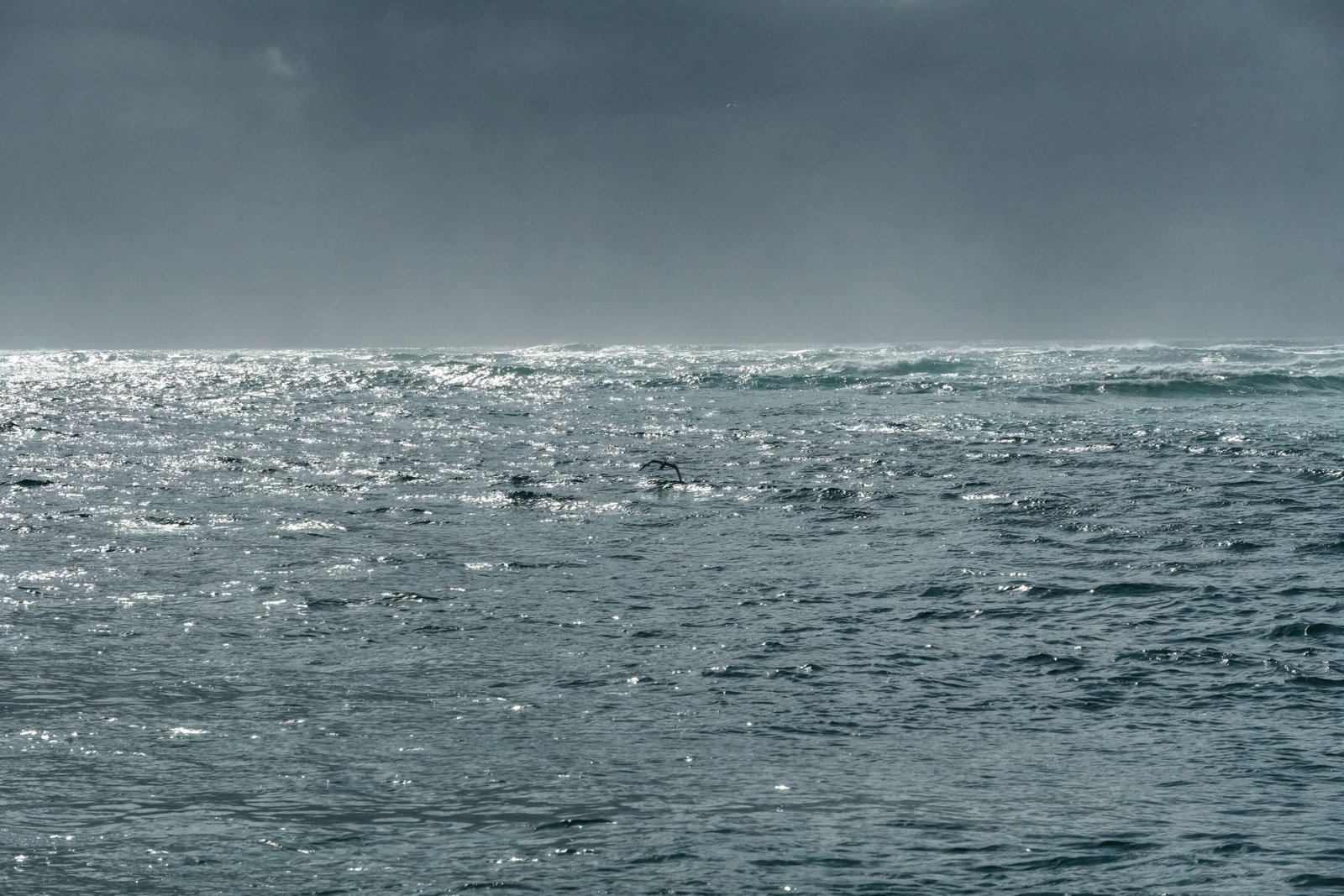 The horizon is frayed by a grey curtain, birds wheel